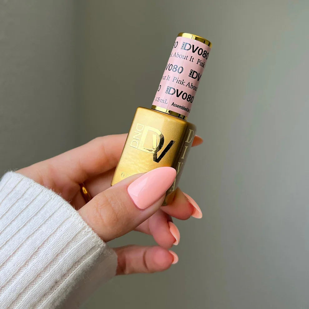 All Colors from DND come in DUOS - GEL/LACQUER. Pink About It DIVA #080 (light peach) ‚- A soft beige-pink pastel that will make you pink about the simple days of youth and innocence.