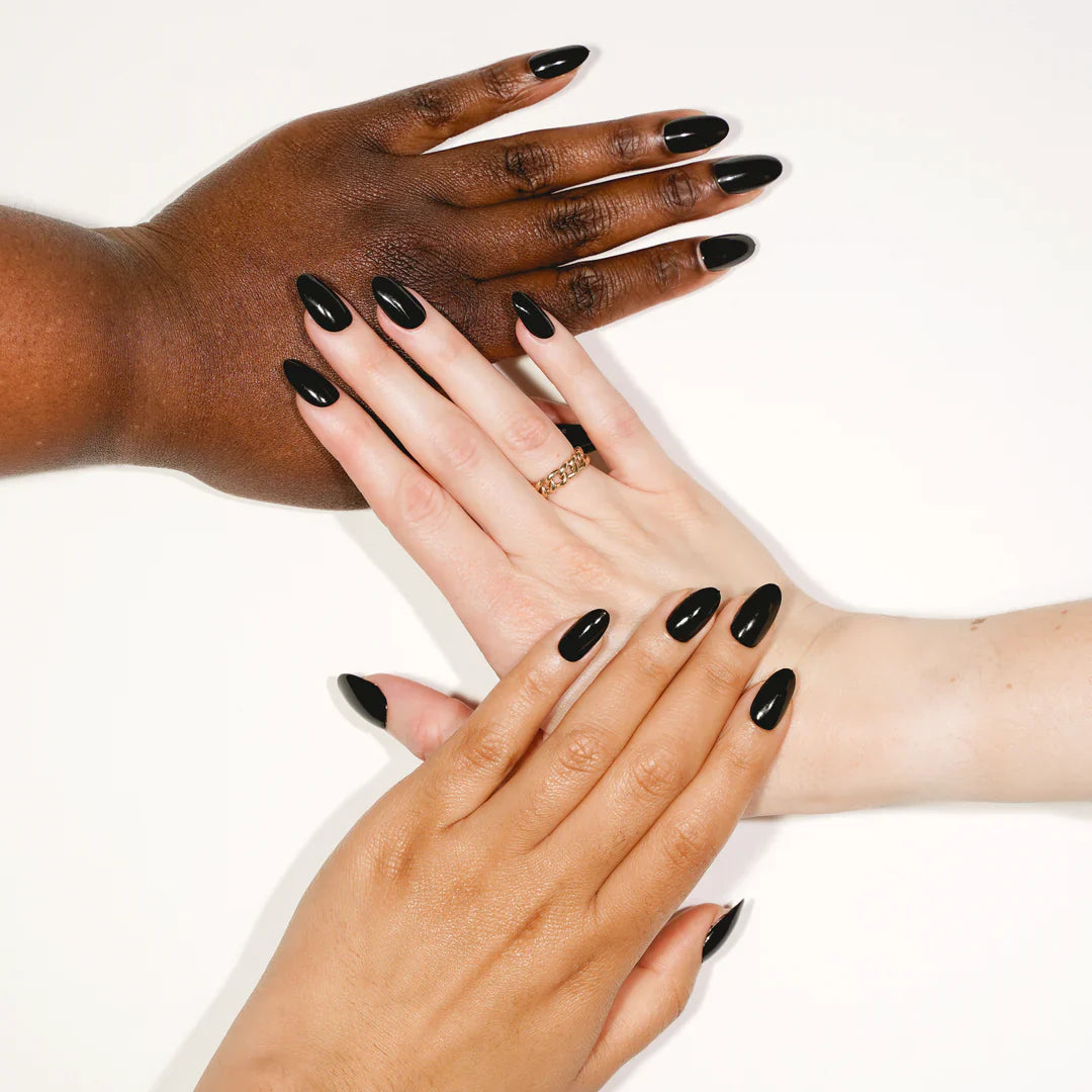 This is your true and crisp solid black color. Everyone always needs a perfect black color for their collection and look no further. Let this creamy bottled black gel formula ease your mind about streaky solid black nails.