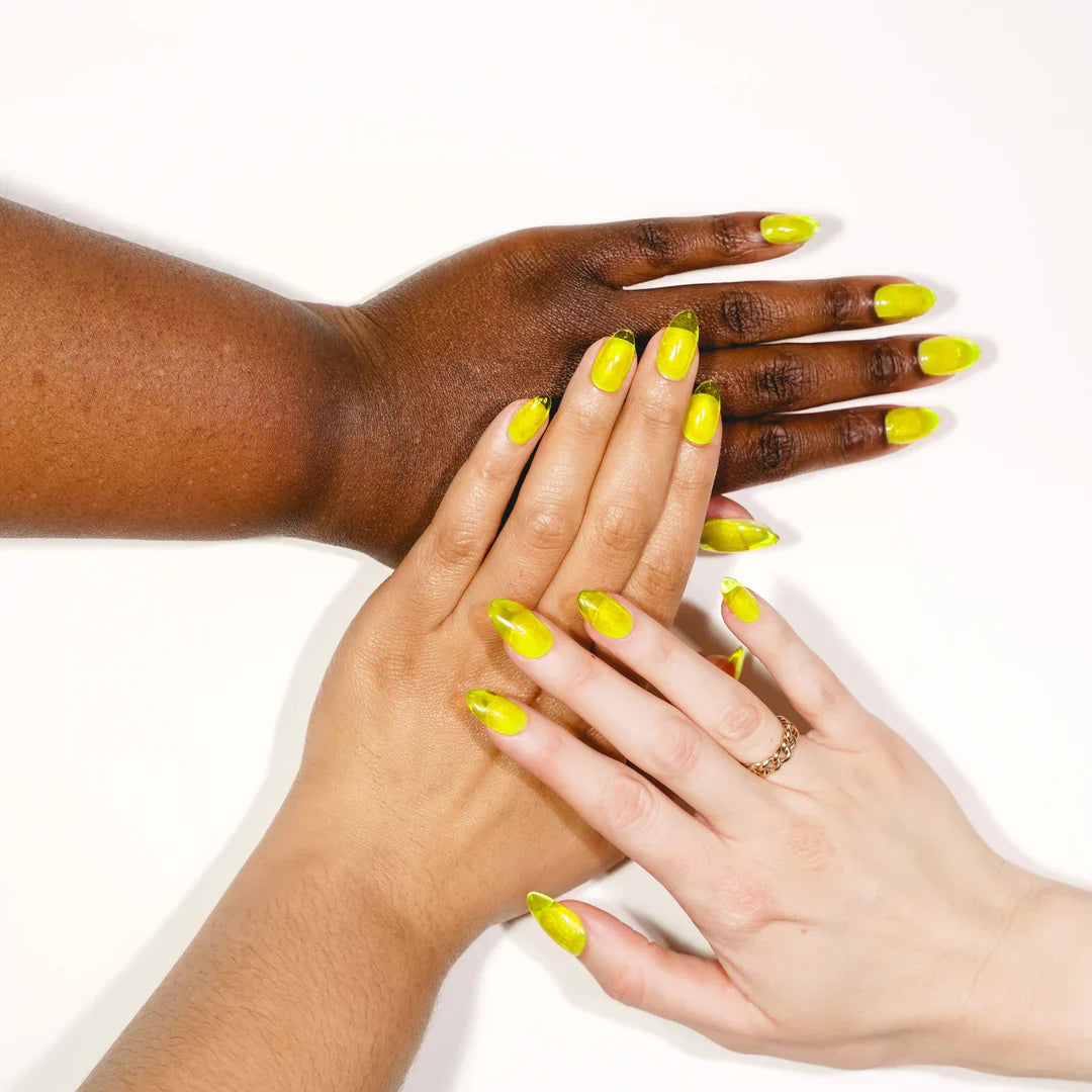 This gel color is a fun neon yellow jelly color. A jelly color means that it is a completely transparent color.